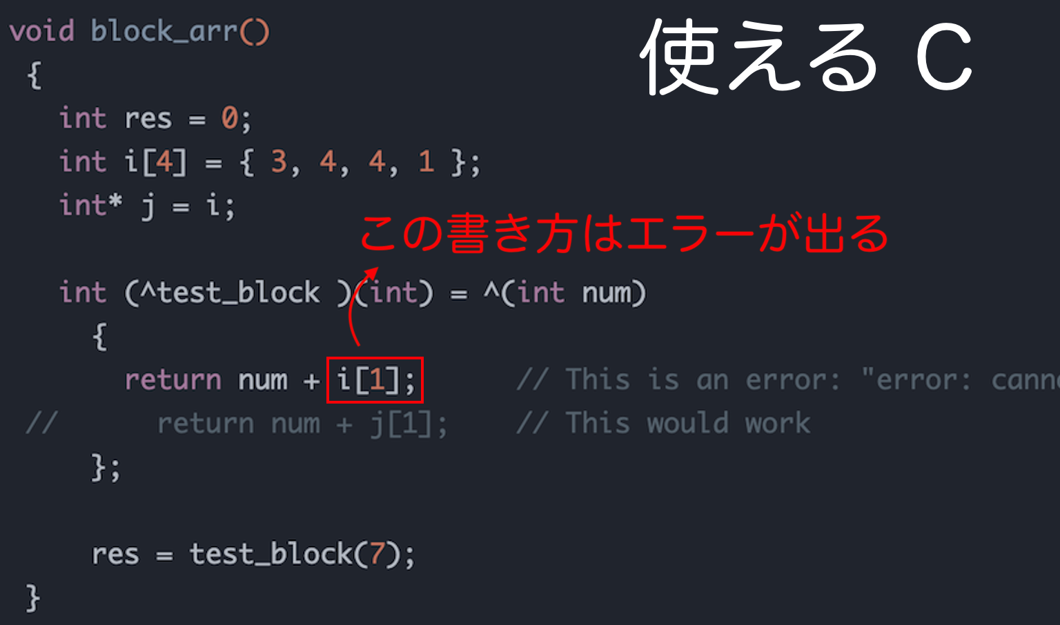 C のブロック内(^ に続く関数のあれ)では、配列への参照はできないらしい。