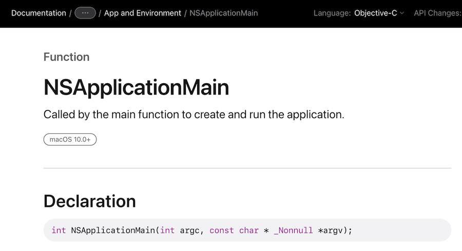 要するにこのコードは argc と文字列配列(のポインタ)argv を NSApplicationMain() に与え、そこからの返り値を待っているという機能をになっている。